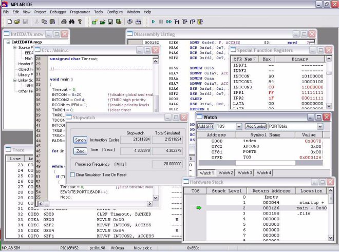 MPLAB Integrated Development Environment (IDE) is a free, integrated toolset for the development of embedded applications employing Microchip's PIC® and dsPIC® microcontrollers. MPLAB IDE runs as a 32-bit application on MS Windows®, is easy to use and includes a host of free software components for fast application development and super-charged debugging. MPLAB IDE also serves as a single, unified graphical user interface for additional Microchip and third party software and hardware development tools. Moving between tools is a snap, and upgrading from the free software simulator to hardware debug and programming tools is done in a flash because MPLAB IDE has the same user interface for all tools.